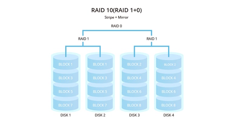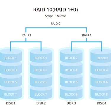 RAID 10 (Mirroring + Striping): Ini adalah kombinasi RAID 1 dan RAID 0. Ini menggabungkan keuntungan mirroring dan striping, memberikan tingkat perlindungan yang tinggi dan kinerja yang baik.